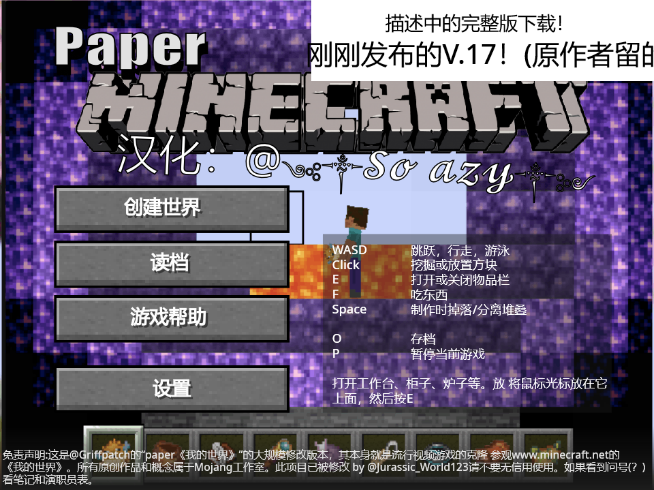 我的世界2D中文版 操作指南: W、A、S、D移动,E打开熔炉,工作台,箱子和门!T开启指令(均翻译成中文)P暂停游戏,O保存游戏,F吃东西,Q丢弃 【其它世界未翻译】 点击主页“帮助”查看更多