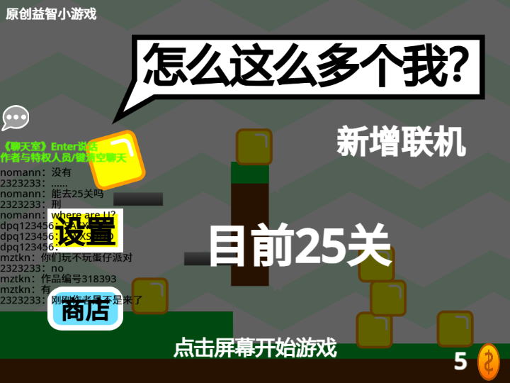 代码量:2559 点个赞吧! 操作: AD键移动 W键跳跃 R重新来 Q选关 长按空格键显示当前关数 长按P键显示在线玩家 预告: 1.5—商店道具补充