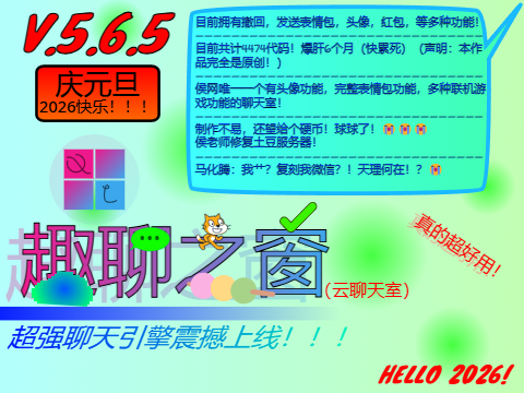 作品名称:趣聊之窗 4474行代码,6个月的打磨,只为铸造图形化编程史上的一大奇迹! 声明:本作品完全是原创! 不会使用此聊天室的就看左下角的使用说明哦! 制作不易,还望给个硬币! 先赞后看,养成习惯! 点赞的人:福气满满,好运连连。平安吉祥,福寿双全!!! 祝大家2026快乐!